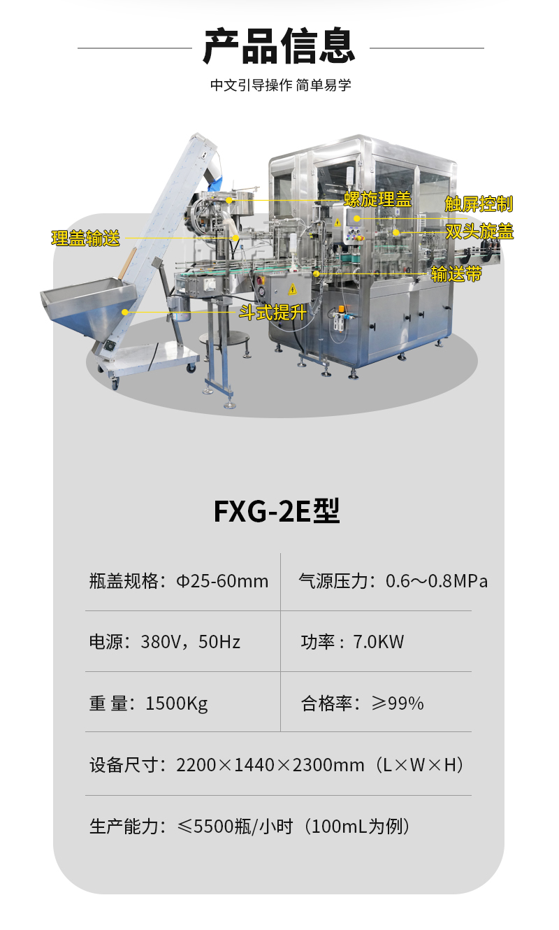 FXG-2E型全自动双头跟随式旋盖机由理盖输盖机构、抓盖旋盖机构、运动模块、输送机构及控制系统组成。整机结构简单、调整方便。该设备为我司新研制,产品在移动过程中,完成旋盖动作。区别于常规旋盖机,在旋盖时需要停顿,会使物料晃出瓶口,污染瓶身。该机旋盖不停顿,有效的避免了旋盖停顿晃液,保持瓶身清洁。