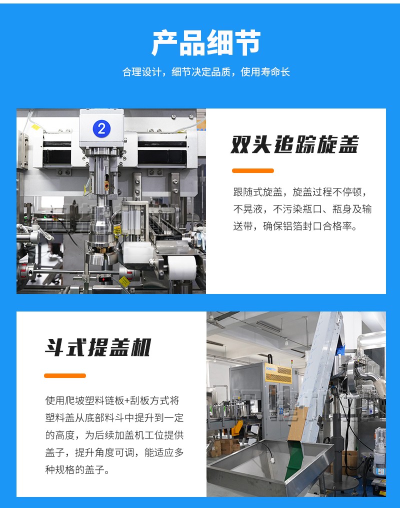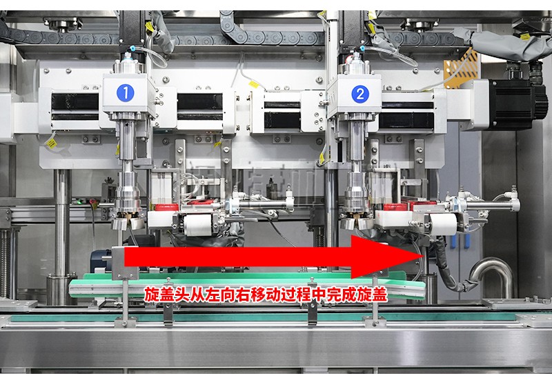 2、品质高:跟随式旋盖,旋盖过程不停顿,不晃液,不污染瓶口、瓶身及输送带,确
