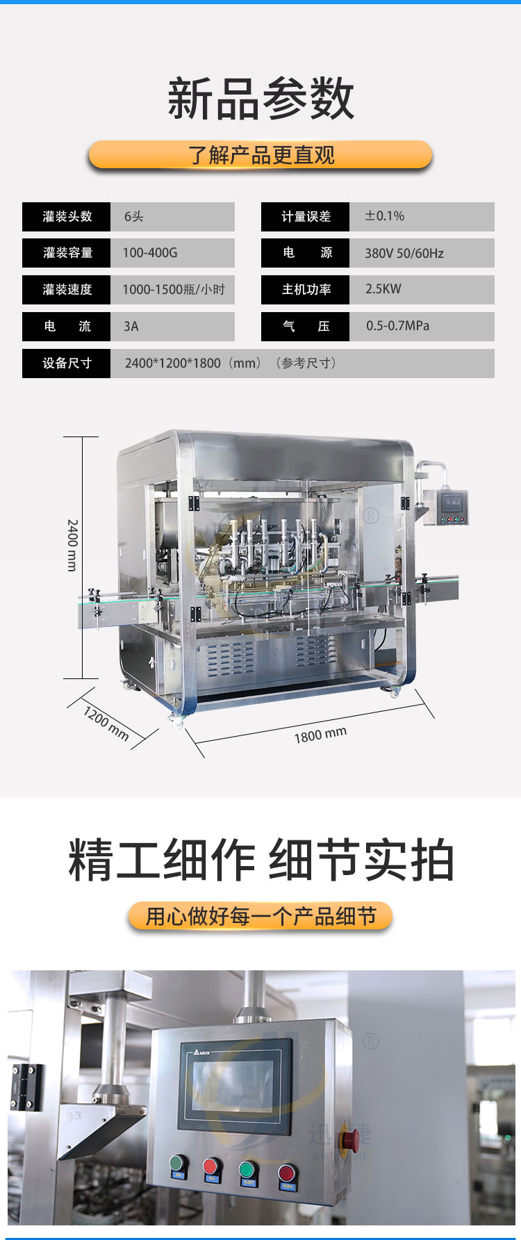 辣椒酱灌装机采用活塞式灌装原理,适用于调味品中带颗粒并且浓度较大的辣椒酱、豆瓣酱、花生酱、香菇酱、果酱、牛油火锅底料、红油火锅底料、虾酱等较为粘稠酱类的灌装。