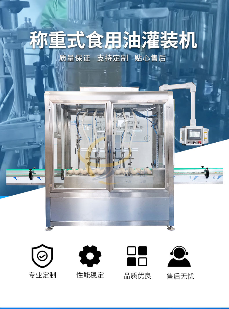 全自动食用油灌装机适用于玻璃瓶、PET瓶、PP桶都可以灌装。包装规格:500ml、900ml1.6L、4L、5L、8L、10L、18L。