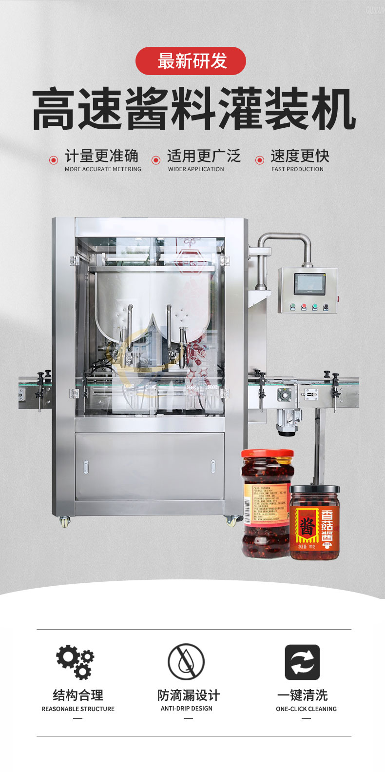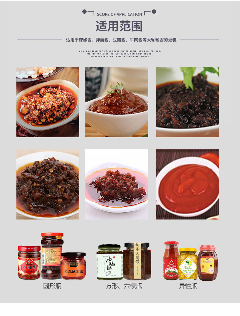 双头高速酱料灌装机适用于调味品中带颗粒并且浓度较大的辣椒酱、豆瓣酱、花生酱、香菇酱、果酱、牛油火锅底料。