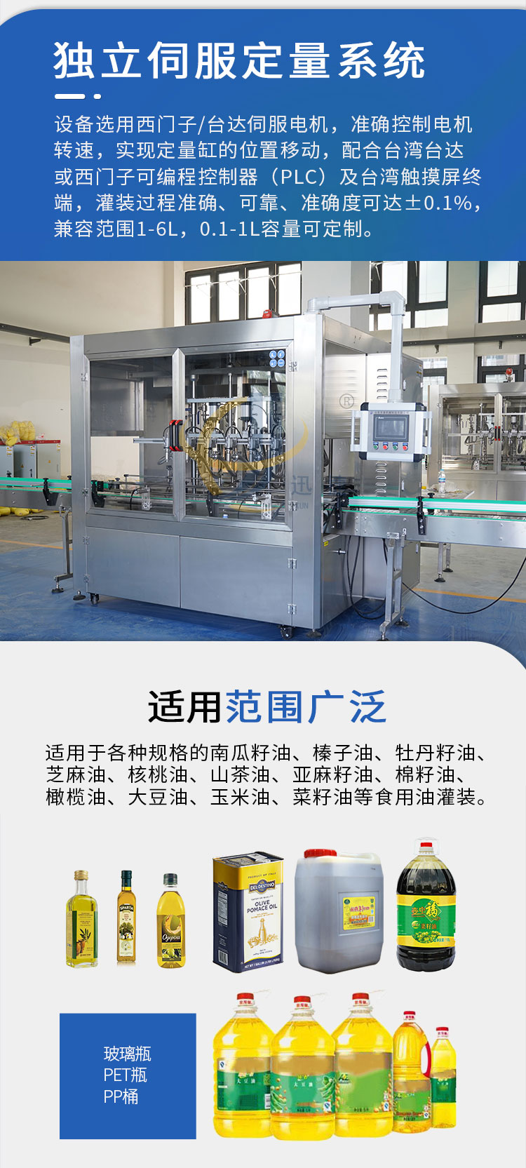 流量计食用油灌装机适用于亚麻籽油、菜籽油、大豆油、芝麻油、橄榄油、花生油、玉米油、山茶油等食用油灌装。