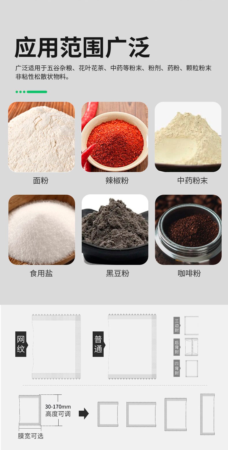粉剂包装机比较适用于豆奶粉、辣椒粉、奶粉、咖啡面粉、面粉等物品的计量包装。与此同时还可以包装淀粉、奶粉、食用盐、中药粉末、调味品、黑豆粉、预混料、饲料、酶制剂等。粉剂包装机包装材料:BOPP薄膜、纸/聚乙烯、玻璃纸/聚乙烯、聚酯/镀铝/聚乙烯、聚酯/聚乙烯、茶叶滤纸等可热封复合包装材料。