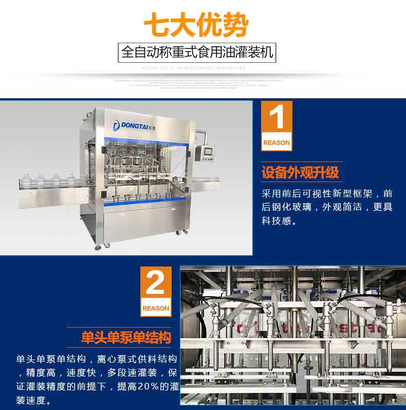 本机适用于对流体5kg-30kg的计重量灌装。自动完成计数进瓶、计重量灌装、输送出瓶等一系列操作。 特别适用于水剂、食用油,润滑油的定量灌装,是食品,医药,化妆品以及精细化工等行业的包装机。本机采用可编程控制器(PLC)、高速工控组态软件进行实时监控的控制,使用调节方便。整机按GMP标准要求制作,各管路连接采用快装方式,拆卸清洗方便,与物料接触部位及外露部位均采用优质不锈钢制造。整机安全、环保、安全、美观、能适应各种不同环境工作。