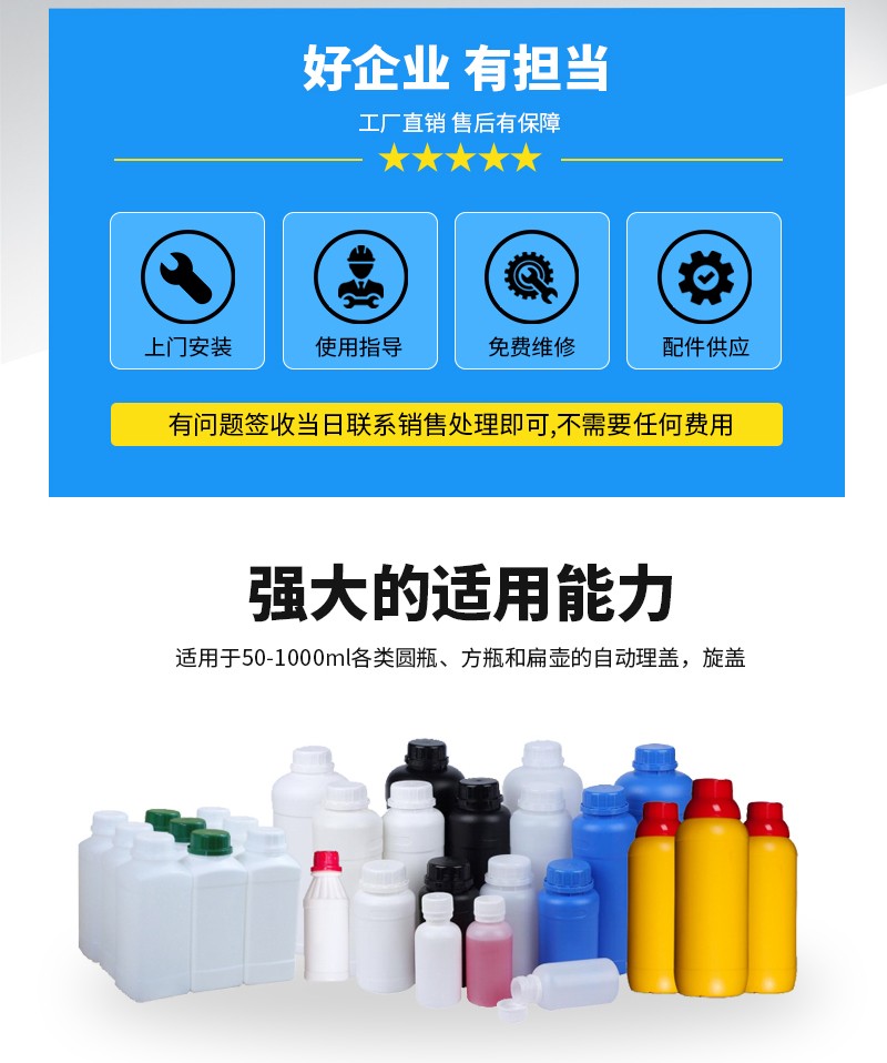 1、通用性强:适用于50-1000ml各类圆瓶、方瓶和扁壶的自动理盖,旋盖;