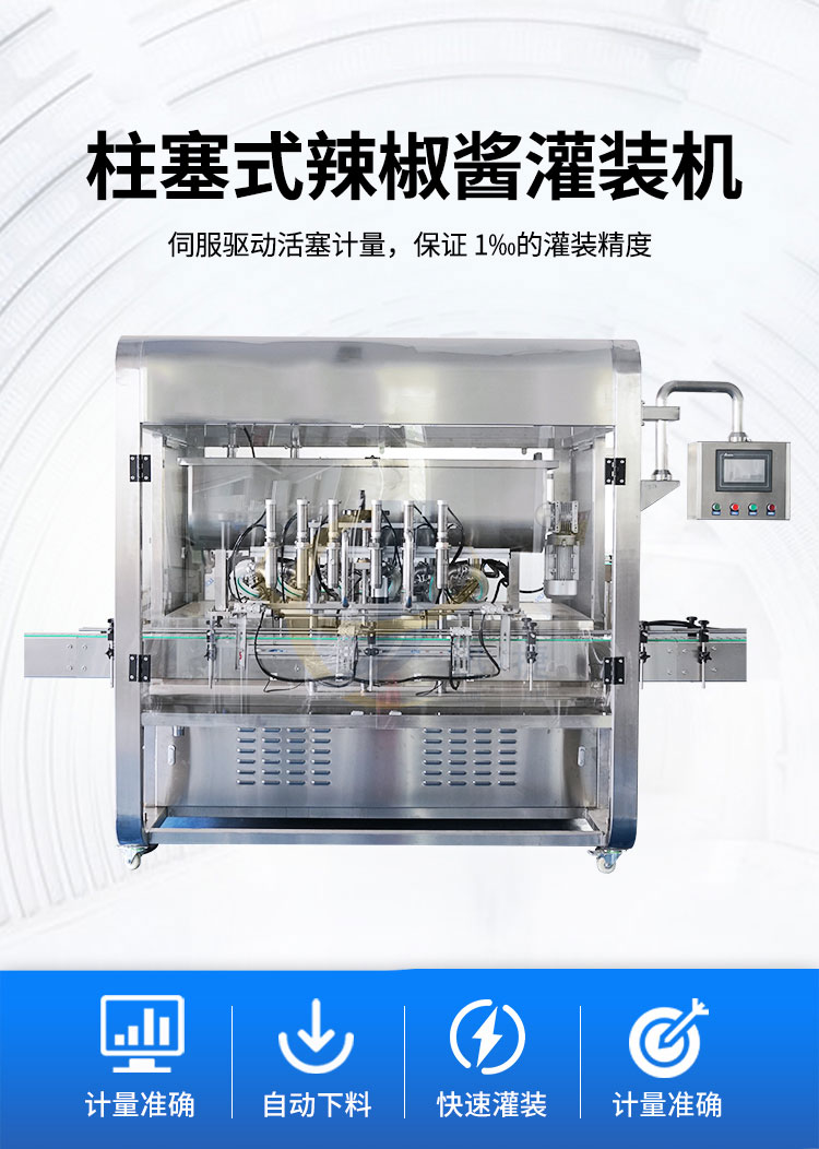 辣椒酱灌装机采用活塞式灌装原理,适用于调味品中带颗粒并且浓度较大的辣椒酱、豆瓣酱、花生酱、香菇酱、果酱、牛油火锅底料、红油火锅底料、虾酱等较为粘稠酱类的灌装。
