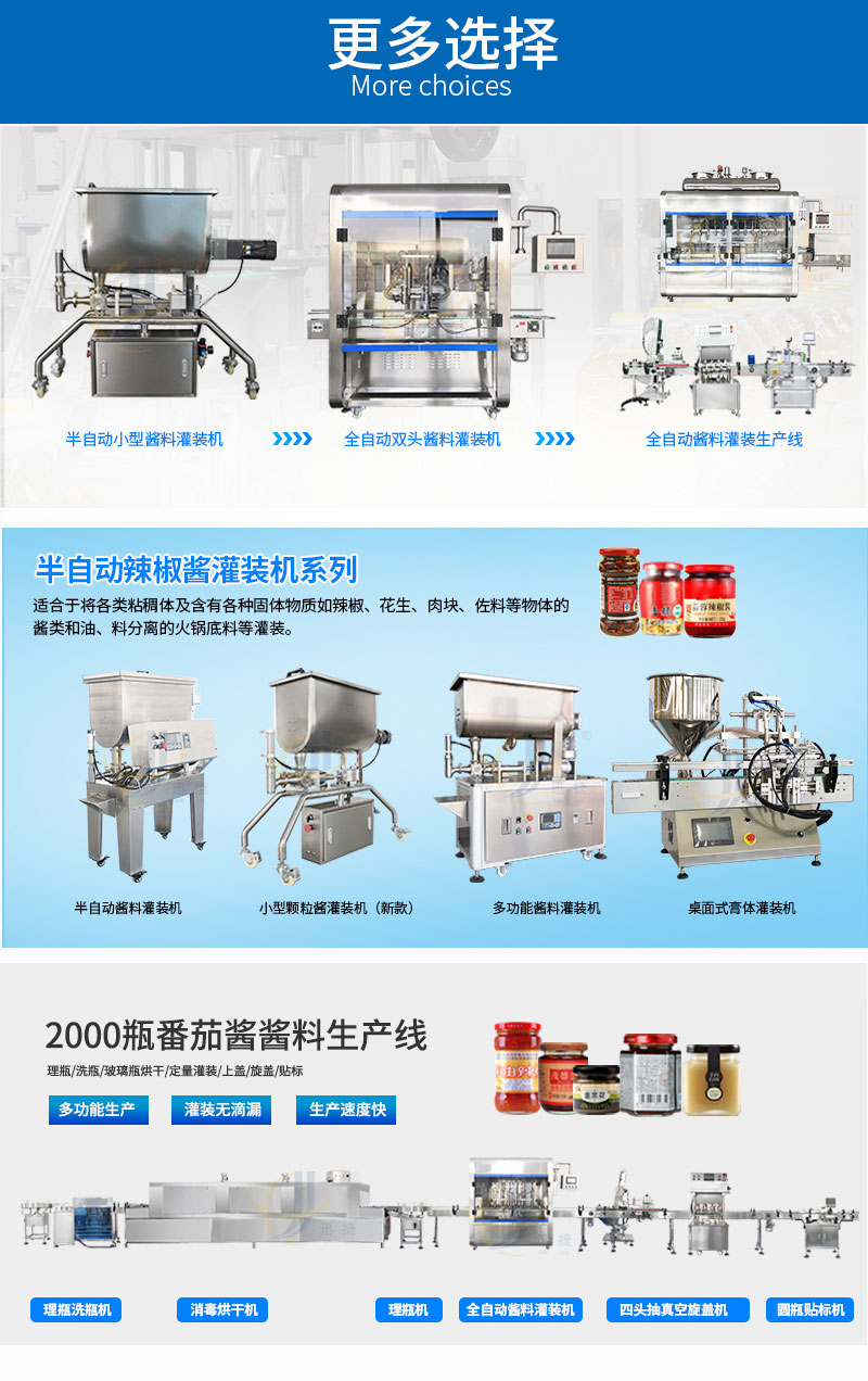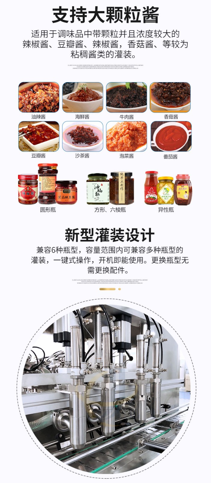 全自动四头辣椒酱灌装机适合中小口径三旋、四旋玻璃瓶调味酱的分装,适合酱料、含颗粒黏稠物料的灌装,物料接触部分均采用