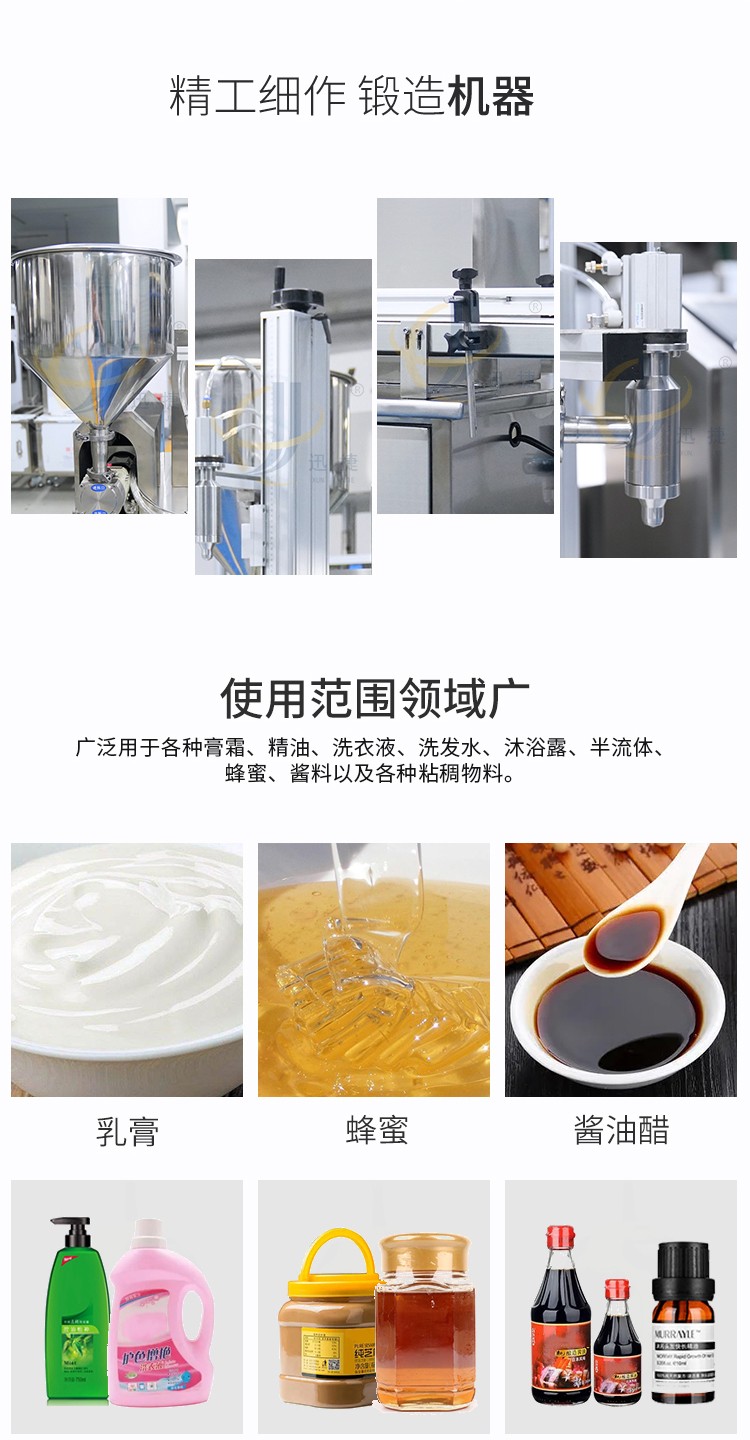单头膏体灌装机适用范围:广泛用于化妆品、食品、医药、化工原料等行业。各种膏霜、精油、洗衣液、洗发水、沐浴露、半流体