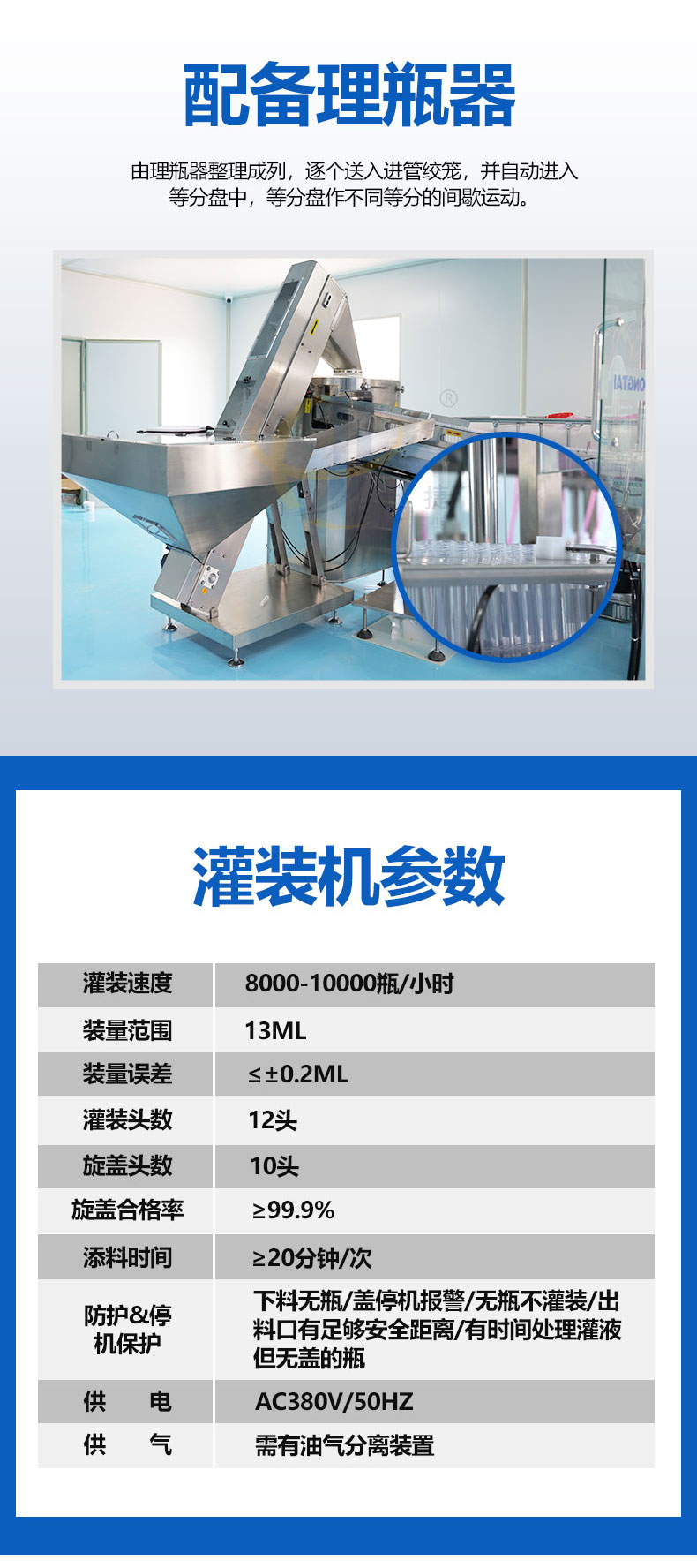 全自动诊断试剂灌装旋盖生产线由理瓶器整理成列,逐个送入进管绞龙,并自动进入等分盘中,等分盘作不同等分的间歇运动。