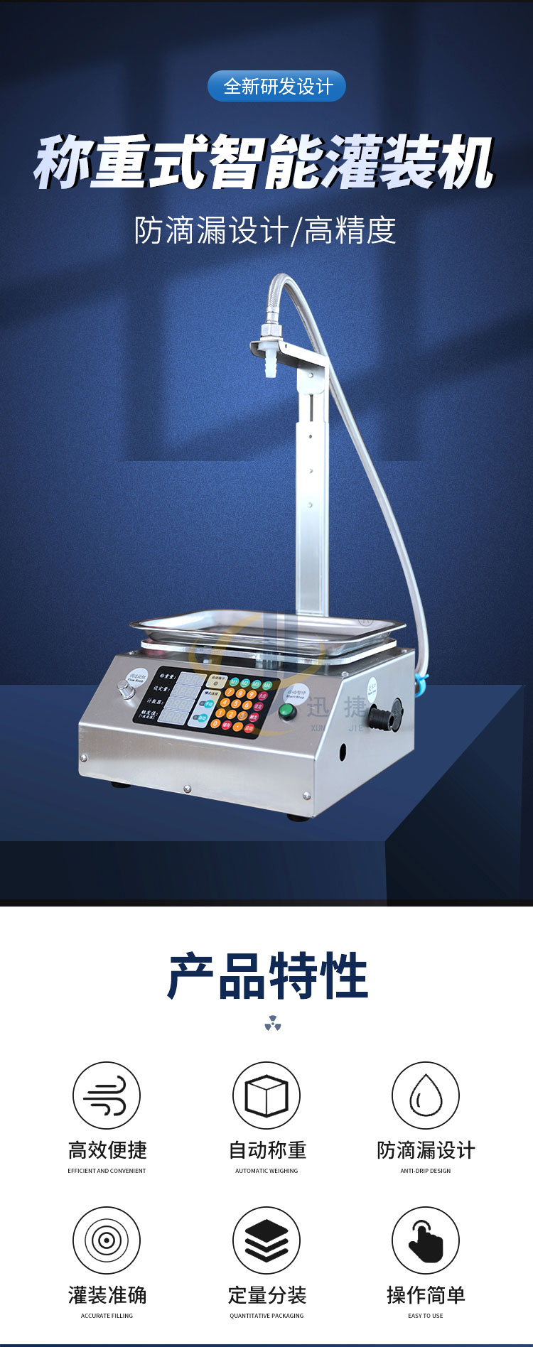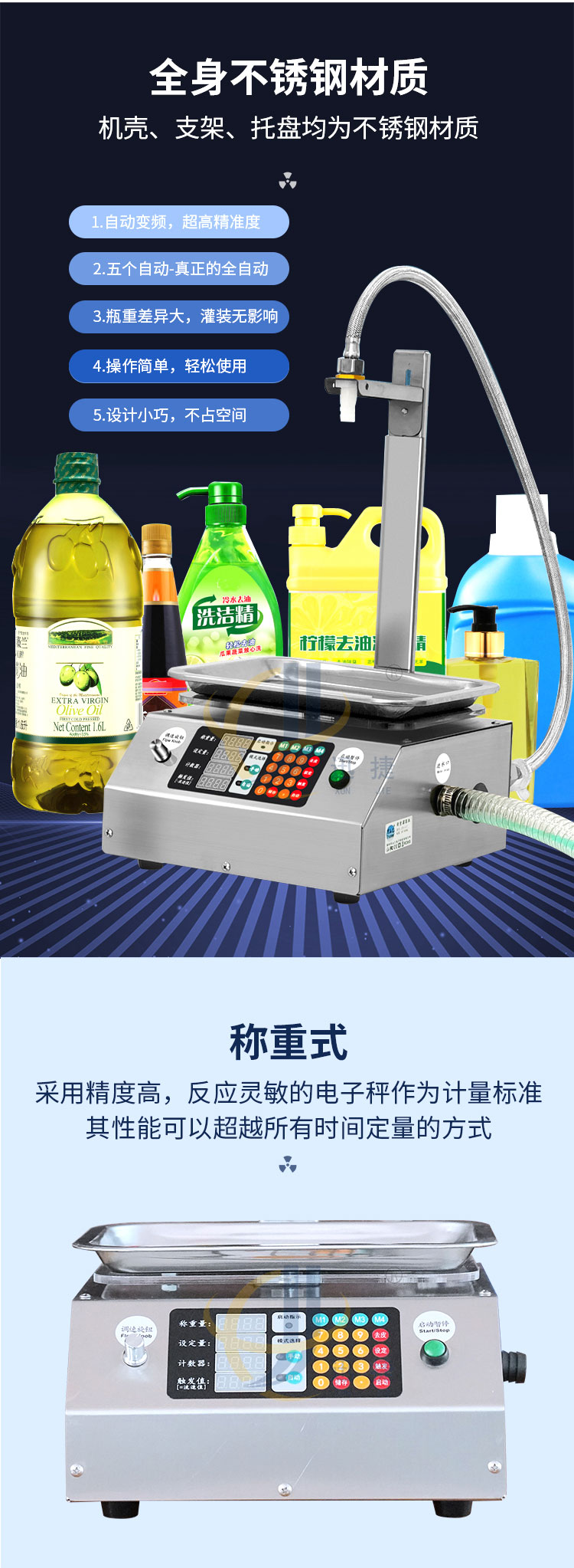 称重式液体灌装机适用于30g-15kg内的各种常见液体灌装。采用精度高,反应灵敏的电子秤作为计量标准。其性能可以超越所有时间定量的方式。